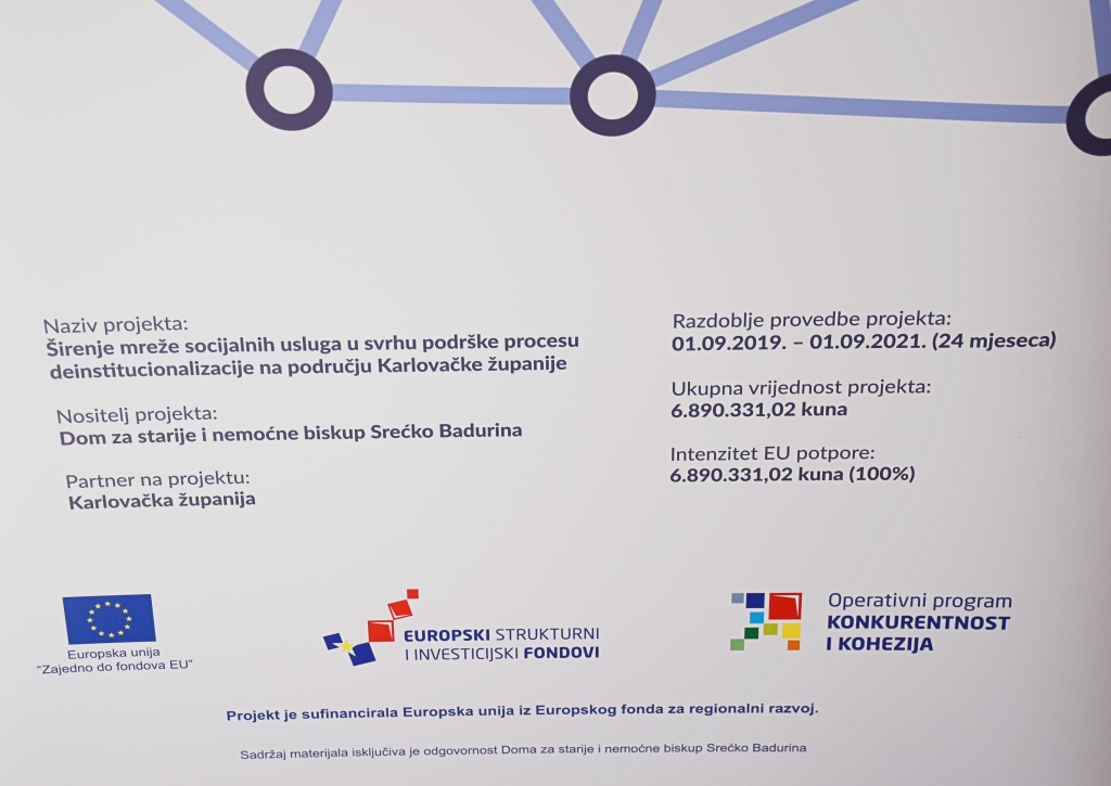 Dom za starije i nemoćne osobe "Biskup Srećko Badurina" Ogulin u završnoj je fazi provedbe projekta čija je vrijednost 6,89 milijuna kuna. Investicija je u cijelosti financirana EU sredstvima, iz Europskog fonda za regionalni razvoj. Tim je povodom zamjenica županice Karlovačke županije Vesna Hajsan Dolinar u srijedu, 11. svibnja, posjetila ovu ustanovu, gdje ju je ugostila ravnateljica Nataša Vučković Ivošević. Ravnateljica je izvjestila da će Dom kroz provedbu projekta povećati kapacitet smještaja, ali i urediti kuhinju s blagovaonom te će se omogućiti topli obrok starijim osobama ogulinskog područja koje nisu korisnici Doma. Kroz uređenje prostora Doma također će se povećati standard korisnika i zaposlenika ove ustanove. Partner na projektu je Karlovačka županija, uz sudjelovanje Opće bolnice i bolnice branitelja Domovinskog rata Ogulin i Udruge Viktorija.