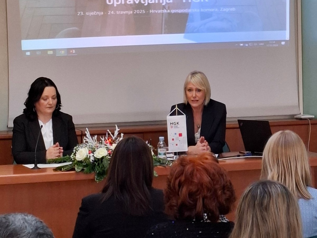 O važnosti izglasanih promjena Zakona o trgovačkim društvima kojima se osiguravaju jednake mogućnosti za sve, edukacijama i osnaživanjem uloge žena na rukovodećim položajima, prije svega kroz Akademiju Budućnost upravljanja govorila je Marina Rožić, glavna tajnica HGK i predsjednica Eurochambres Women Network.