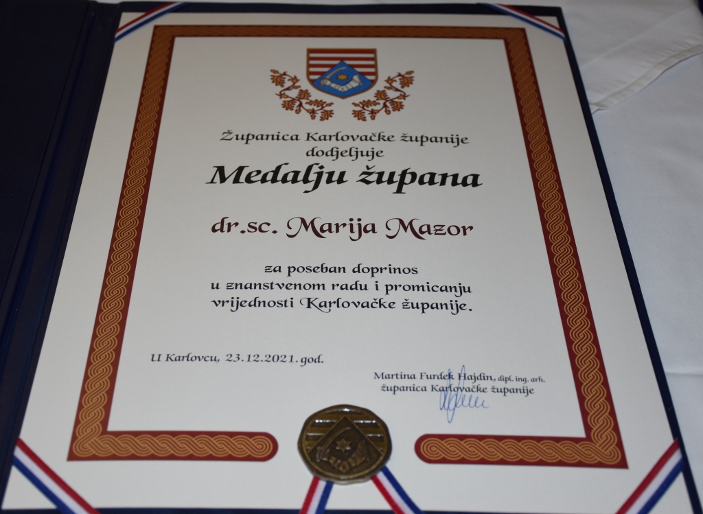 Za vrijedna postignuća ove ambiciozne mlade znanstvenice županica Karlovačke županije Martina Furdek Hajdin dodjelila joj je Medalju župana. Ova vrijedna nagrada i priznanje zajednice u kojoj živi bit će joj poticaj za nova znanstvena postignuća i još predaniji rad.