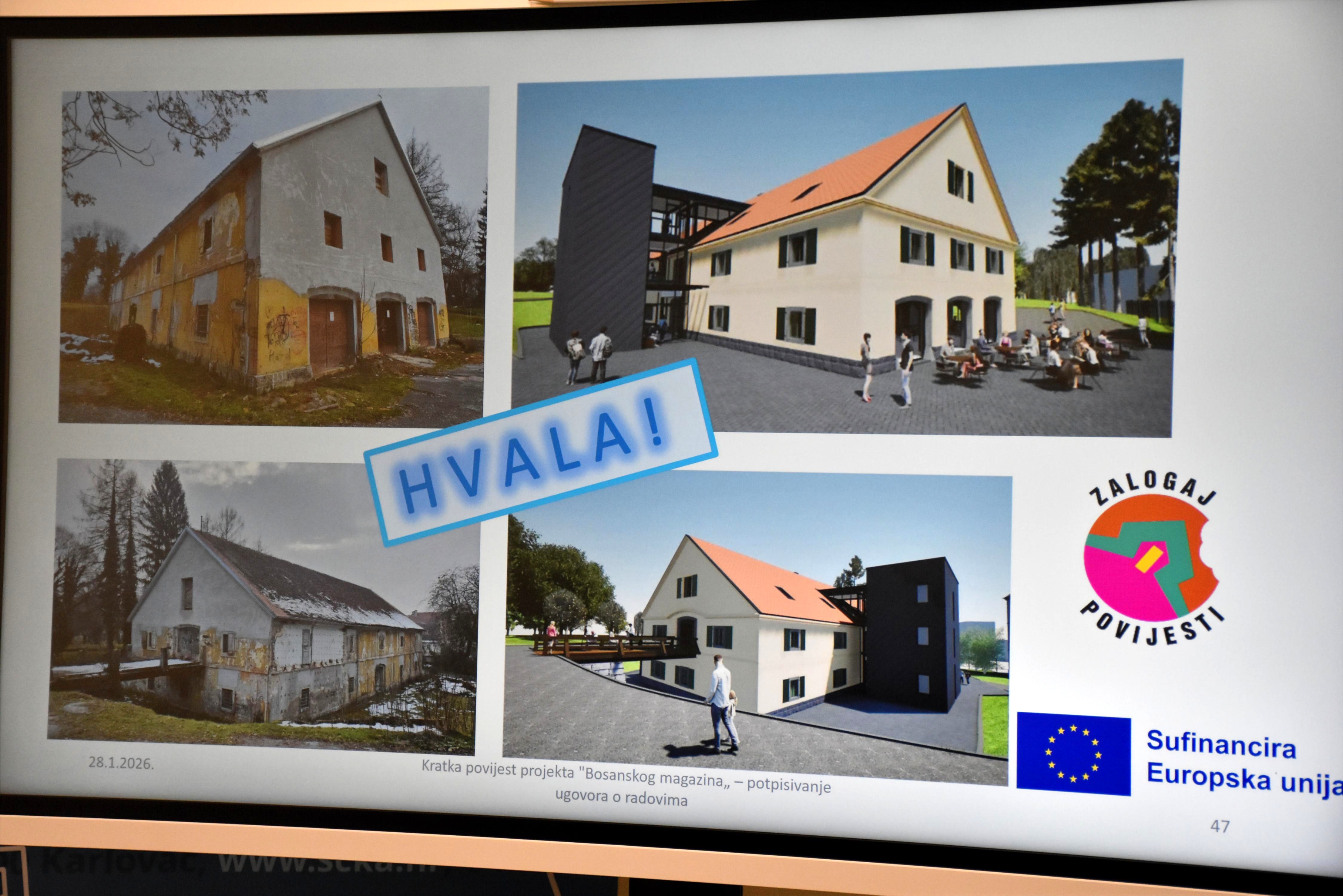 Radovi na projektu „Zalogaj povijesti“ kojim će se povijesna zgrada Bosanskog magazina rekonstruirati u restoran studentske prehrane i interpretacijski centar počinju idući mjesec. Potpisan je ugovor između izvođača radova i Studentskog centra Karlovac.