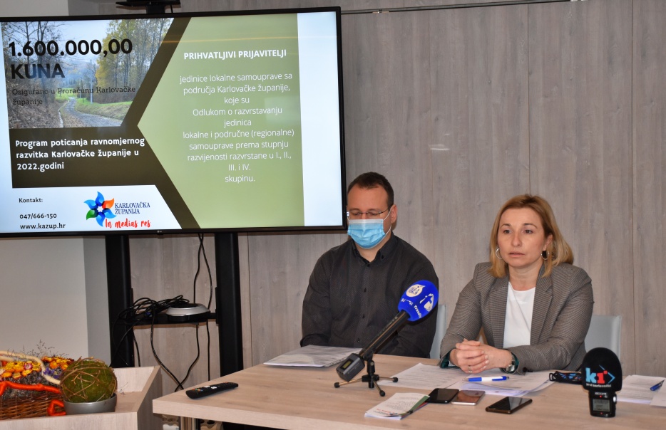 Za provedbu Programa poticanja ravnomjernog razvitka Karlovačke županije u 2022.godini su u Proračunu Karlovačke županije osigurana sredstva u ukupnom iznosu 1.600.000,00 kuna. Program će se provoditi kroz tri mjere: