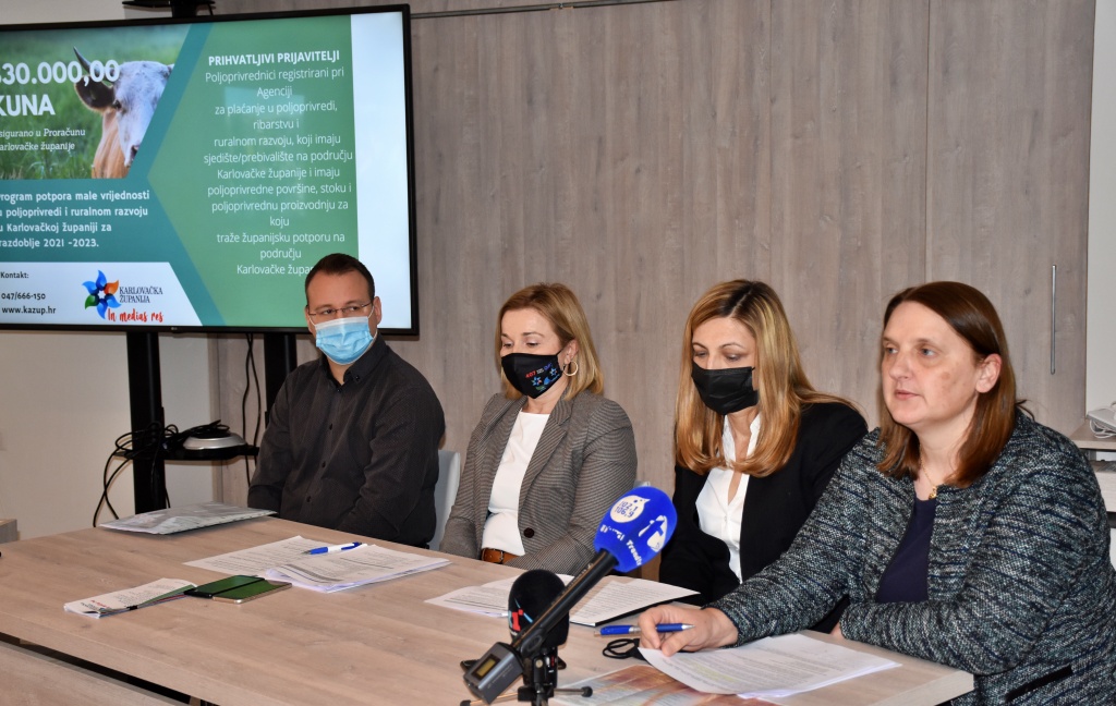 Program potpora male vrijednosti u poljoprivredi i ruralnom razvoju u Karlovačkoj županiji za razdoblje od 2021. – 2023. godine, donesen je na 29. sjednici Županijske skupštine Karlovačke županije, a Odluka o izmjenama i dopunama Programa nalazi se na e - savjetovanju i traje do 23. veljače 2022. godine. Cilj Programa je razvoj, unapređenje i modernizacija poljoprivredne proizvodnje i očuvanje ruralnog prostora, stvaranje povoljnih uvjeta za poljoprivrednu proizvodnju, povećanje kvalitete poljoprivrednih proizvoda, edukacija stanovništva na ruralnom prostoru, stvaranje novih radnih mjesta te zadržavanje stanovništva na ruralnom prostoru. Za provedbu Programa u Proračunu Karlovačke županije za 2022. godinu osigurana su sredstva u iznosu 830.000,00 kuna.