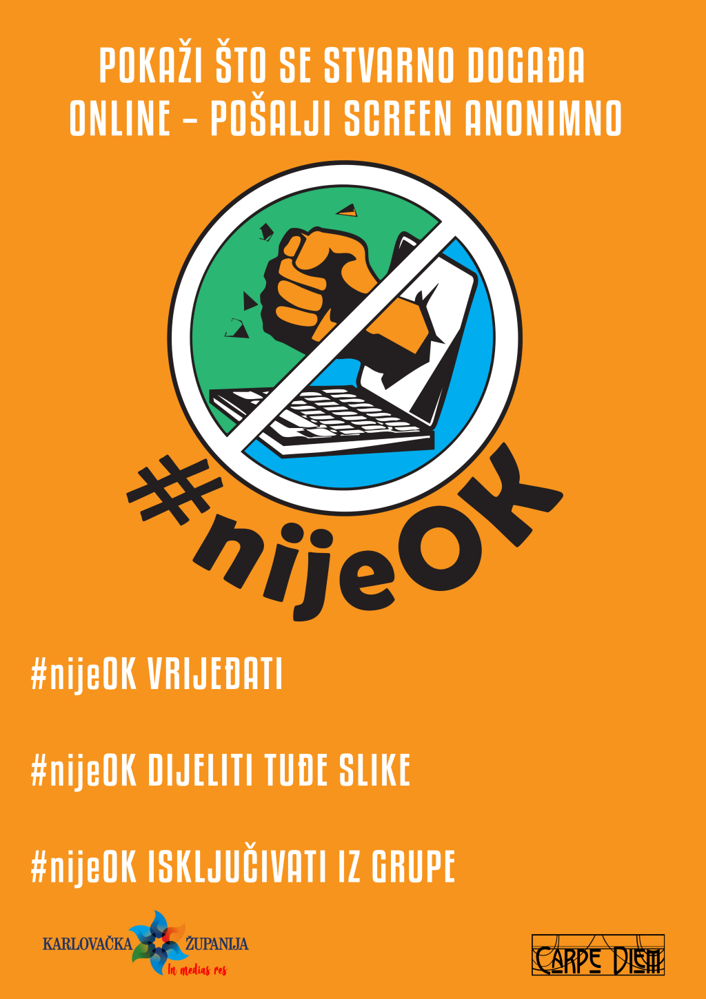 Na Svjetski dan mentalnog zdravlja, Karlovačka županija i Udruga Carpe Diem predstavili su projekt #nijeOK, koji se bavi mentalnim zdravljem mladih, s naglaskom na problem neprimjerenog vršnjačkog nasilja na internetu. Pomoću digitalnih alata, projekt će mladima dati priliku da sami anonimno kažu – što se događa na internetu, a nije OK.